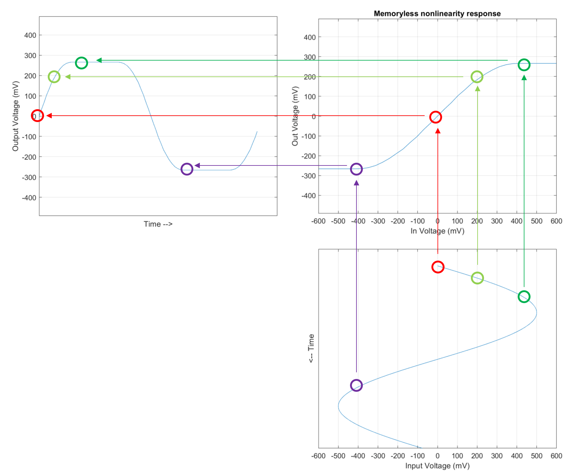 A memory-less nonlinearity is a function where the output at time t is only dependent on the input at the same time t. This means that the function has no memory of prior inputs and is thus "memory-less". The following graphic shows how input voltages are mapped to the output voltage using the MNL response. It is essential that this response is a function where each input value is uniquely mapped to an output value. The implementation of such a MNL in the system object, serdes.SaturatingAmplifier, is through a lookup table with linear interpolation between data points.