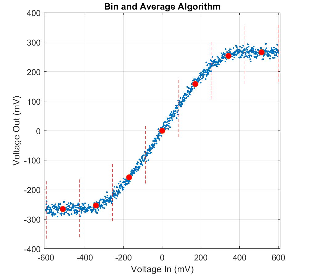 For simplicity, this example uses a non-parametric estimation approach here, which is bin and average, as illustrated below. First the data is horizontally separated into several bins. Then within each bin, the vertical axis values (the circuit output voltage) are averaged to reconcile any variation. The center of the bin and average form the tabulated voltage in versus voltage out response. This approach will yield sufficient results if an adequate number of bins are used such that the piece-wise linear result has minimal deviation from the data. In the illustration, only 7 bins are used, and it can be observed that the second and the second to last bin average have a slight bias to them, which could have been reduced if more bins were utilized. For this example, we use 29 horizontal bins so it shouldn't have this issue.