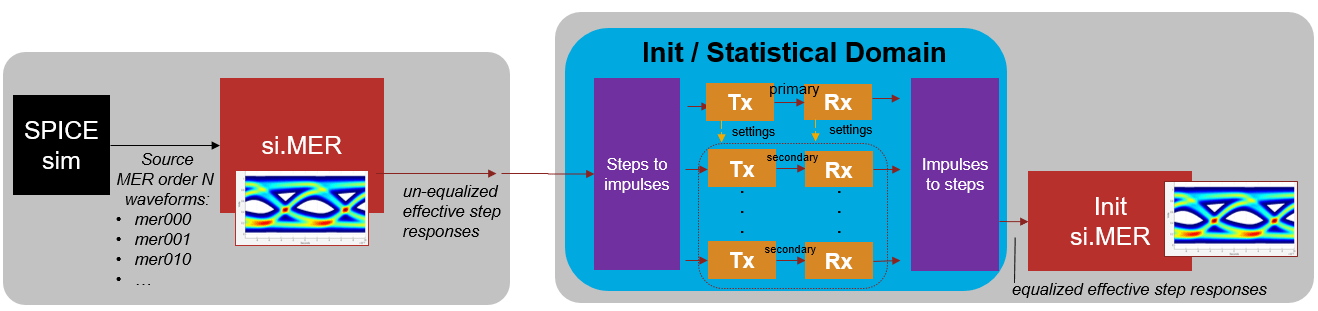There are two ways of defining the inputs to the si.MER object, one is to generate the source input waveforms as illustrated in the other MER examples and the second is to directly input the effective step responses. This example is all about the effective step responses as illustrated in the analysis overview diagram below. First, create a MER representation with source waveforms as the input and obtain the unequalized effective step responses from the MER object. To apply equalization to these waveforms with AMI models, convert them to impulse responses (which is a standard input to AMI models), process them with the AMI model and then convert them back to step responses with the appropriate polarity (i.e. rising or falling steps). These equalized effective step responses are then used to define the statistical MER object, from which you can get the equalized statistical eye. The nuances and assumptions necessary for this process are outlined in this example.