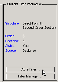 [フィルター設計] ボタンは、フィルター設計用に係数を計算した後は無効となります。フィルター仕様に何らかの変更を加えると、このボタンは再び有効になります。