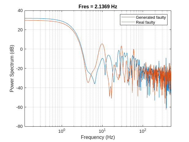 pspectrum([x(:,1011) x(:,2100)],Fs) set(gca,'XScale','log') legend('Generated faulty','Real faulty')