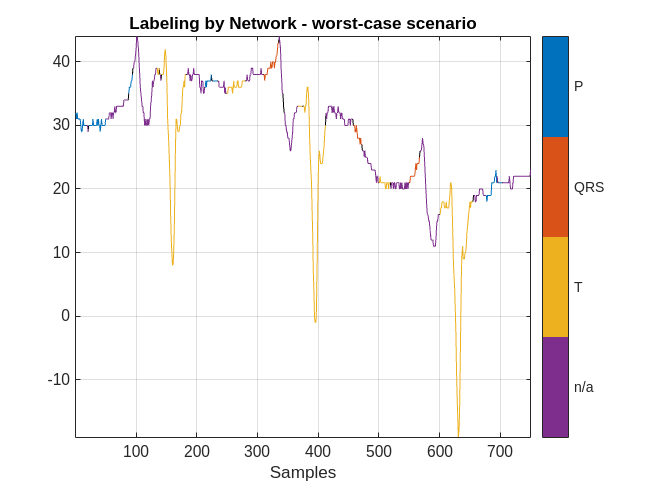 ネットワークが生成したラベル付けの結果を評価し、その結果をグラウンド トゥルースと比較します。このネットワークでパフォーマンスが最高および最低だったケースの ECG 信号のインデックスを見つけます。
