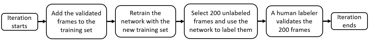次の反復では、新しくラベル付けされた 200 個のフレームを currentTrainingSet セットに追加して、ネットワークに再学習させ、ラベル付け反復を繰り返すことができます。次のチャートは、最初の反復後の各反復におけるワークフローを示しています。