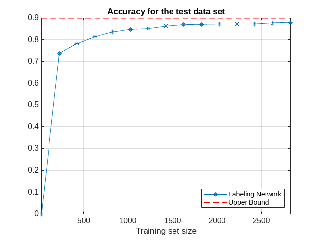 figure examinedDataSize = 25:200:2825; plot(examinedDataSize,networkAccuracy,'*-') hold on % Prediction accuracy upper bound plot(examinedDataSize,ones(1,15)*accuracyAll,'r--') grid on xlabel('Training set size') title('Accuracy for the test data set') xlim([25 2825]) legend('Labeling Network','Upper Bound','Location','southeast')