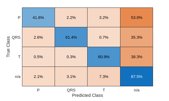 図の学習の精度と損失のサブプロットは、すべての反復回数間の学習の進行状況を追跡します。生の信号データを使用して、ネットワークは、P 波、QRS 群、T 波、またはラベル付けされていない領域 "n/a" に属するものとして、サンプルの約 77% を正しく分類します。