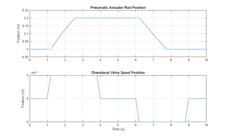 シミュレーション中、方向制御バルブのスプールは正方向の最大変位まで動かされ、アクチュエータはそのエンド ストップに到達するまで負荷を動かします。その後、バルブが中央に位置付けられ、負荷が保持されます。次に、バルブが負方向の最小位置まで移動し、アクチュエータがその最小長まで後退します。その後、バルブが再び中央に位置付けられ、負荷がその位置にロックされます。