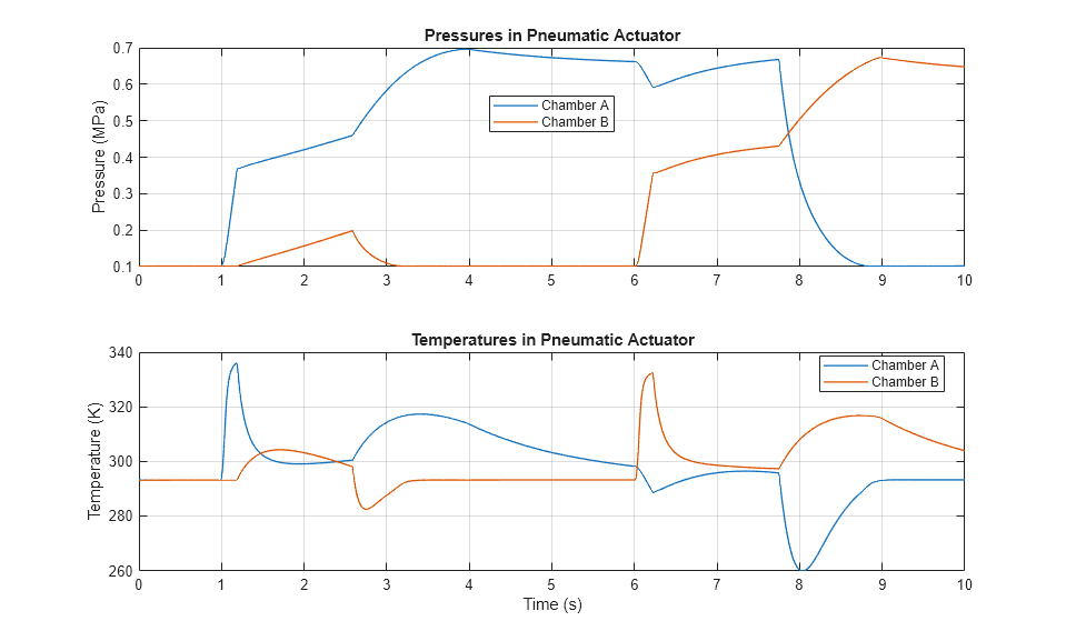 この例では、制御されたアクチュエータを、簡略化されたカスタムの空気圧コンポーネントを使用してモデル化する方法を説明します。圧力と温度として定義された 2 つのアクロス変数、および質量流量と熱流量として定義された 2 つのスルー変数があります。アプローチが簡略化されているということは、回路内のすべてのノードに、そのノードに関連付けられた気体体積がなければならないことを意味します。回路内の気体の物理的体積は、Constant Volume Pneumatic Chamber ブロック、Pneumatic Piston Chamber ブロックおよび Pneumatic Atmospheric Reference ブロックによって表されます。一方、Foundation Library の気体コンポーネントでは、各ノードにおけるこのような接続ルールは必要ありません。Foundation Library の気体コンポーネントを使用して空気圧システムをモデル化する、より機能的な方法については、空気圧駆動回路の例を参照してください。