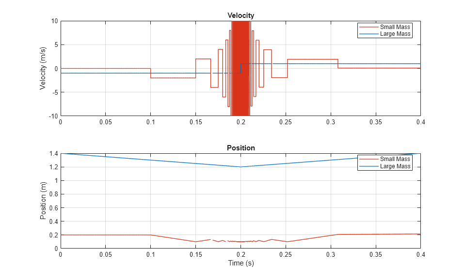 次の図は、2 つの塊の位置と速度をプロットしたものです。小さい塊が壁または大きい塊に衝突するたびの速度の瞬時の変化、および小さい塊が大きい塊の方向を逆にしたときの大きい塊の速度の変化が示されています。