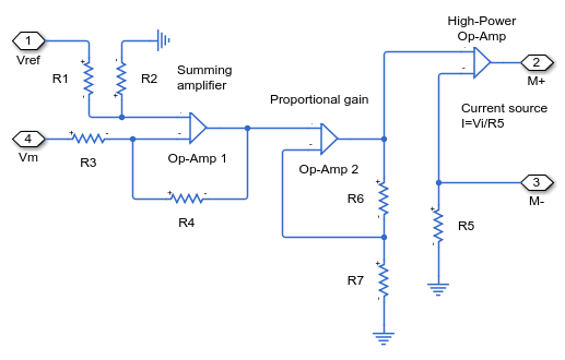 比例コントローラーと微分コントローラーがオペアンプを使って実装され、その最終段階が電流源として設定されます。これにより、抵抗およびインダクタンス項がモデル化されたトルク モーターが駆動されます。トルク モーターはスプール バルブを直接作動させ、スプール バルブは油圧ポンプを供給するメイン油圧回路を制御します。最後に、このポンプが汎用の機械的負荷を駆動します。