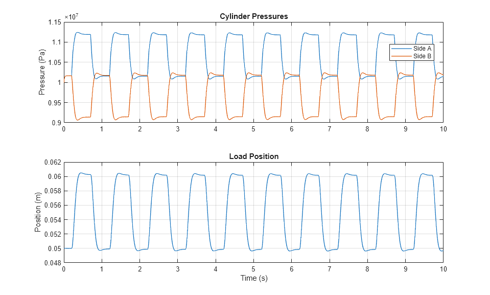 以下の図は、MATLAB Figure にプロットされたシリンダーの圧力と負荷の位置を示しています。このデータは、モデル キャンバスで View cylinder pressures ハイパーリンクをクリックするか、モデルの [シミュレーション] タブで [データ インスペクター] ボタンをクリックして、シミュレーション データ インスペクターでも確認できます。