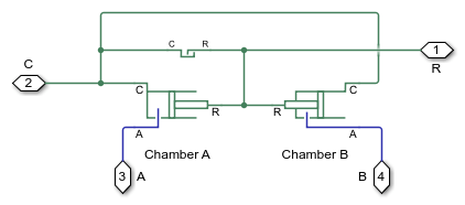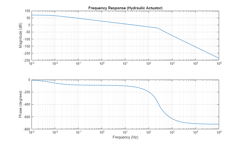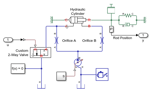 この例では、等温流体ドメインに実装されている複動式シリンダーと共に閉ループ回路で動作する双方向バルブを説明します。コントローラーは、連続時間伝達関数に伝達遅延を加えたものとして表されます。離散時間で実装された場合、計算時間 (1 離散時間周期)+ゼロ次ホールド (1/2 離散時間周期) が遅延として見込まれます。周波数応答を生成できるように、モデルは線形に構成されています。より高速なデスクトップ シミュレーション構成にするには、伝達遅延をコメント スルーし、ソルバーの最大ステップ サイズを大きくします。
