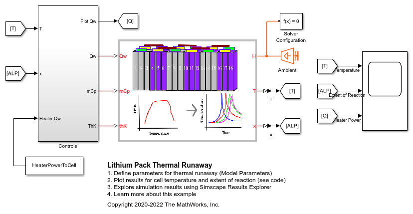 この例では、リチウムイオン バッテリー パック内の熱暴走をモデル化する方法を説明します。このモデルは、設計に基づくセルの熱発生、セル間の熱のカスケード、およびそれによるセル内の温度上昇を測定します。セルの熱暴走を引き起こす過熱は、熱量計データを使用して計算されます。シミュレーションを実行して、1 つのセルのみが過熱した場合に熱暴走モードになるセルの数を評価します。セル間の熱カスケードを遅延させるか、相殺するために、この例ではセル間の熱障壁をモデル化しています。