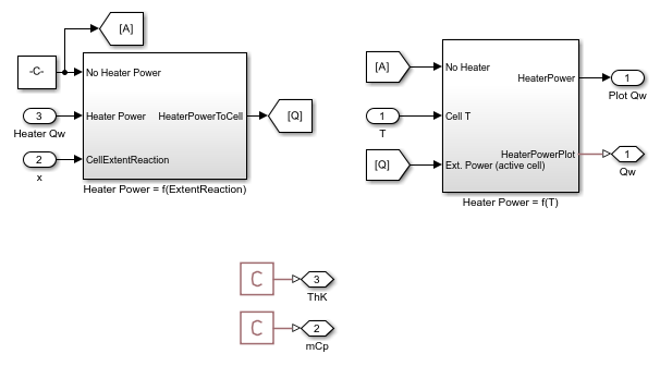mCp - 各セルの熱質量の変化。0 より大きい割合として指定します。セルの実際の熱質量を得るために、この値はセルの熱質量に乗算されます。"mCp" 端子の値は、セルの反応に伴うセルの熱質量の変化をモデル化します。この例においては、"mCp" 端子の値は、時間またはセルの反応によって変化しません。