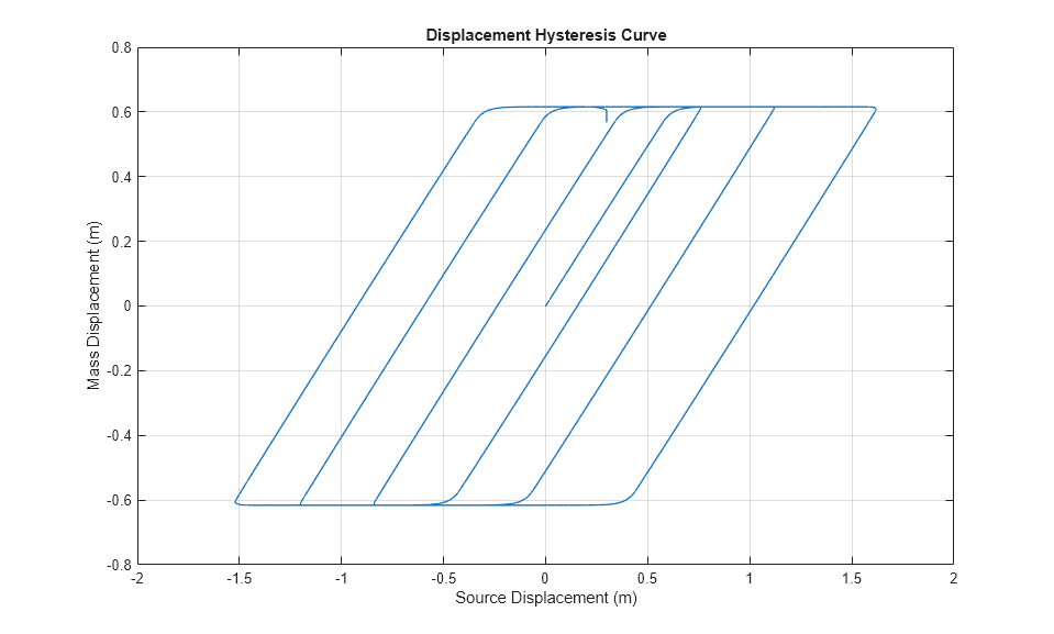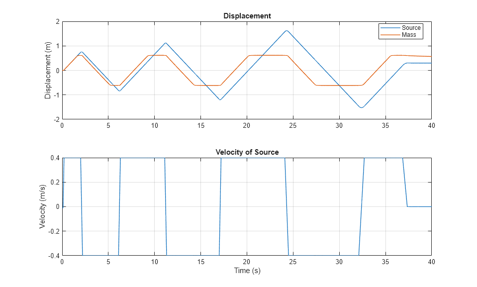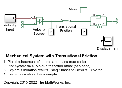 この例では、バネおよび粘性ダンパーに取り付けられた質量負荷を示します。質量は摩擦素子を通じて理想的な速度源によって駆動されます。速度源のモーション プロファイルは、速度源が提供する変位に対して質量の変位をプロットすると典型的なヒステリシス曲線になるように選択されます。
