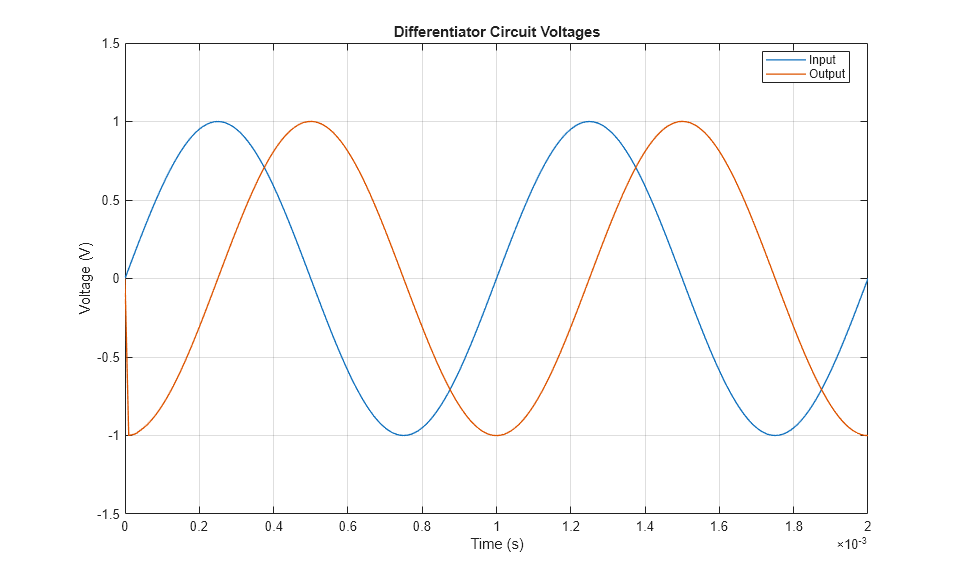 このモデルは PID コントローラーなどの一部として使用されることがある微分器を示しています。さらに、一部の理想化された回路において数値シミュレーションの問題がどのようにして起きるかも示しています。このモデルは、直列補償コンデンサの寄生抵抗をその既定値である 1e-6 Ω に設定して実行されます。これをゼロに設定すると警告が表示され、シミュレーションが非常に遅くなります。詳細はユーザー ガイドを参照してください。