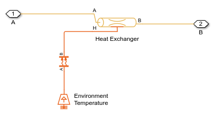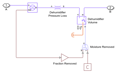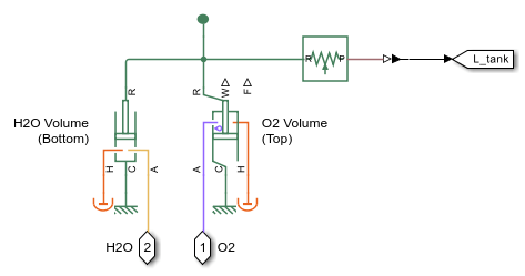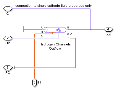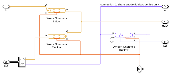 カスタム MEA ブロックは Simscape コード Electrolyzer.ssc で実装されます。熱流体端子 H2O を使用して、熱流体ネットワークから水が除去されます。生成された H2 と O2 および移送された H2O は、Controlled Trace Gas Source (MA) ブロックと Controlled Moisture Source (MA) ブロックを使用して 2 つの湿り空気ネットワークに追加されます。余剰熱は熱端子 H を経由して、接続されている Thermal Mass ブロックに送られます。実装の詳細については、コード内のコメントを参照してください。