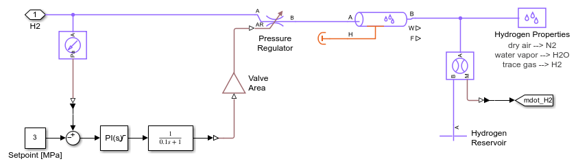 カソード側で生成される水素は、MEA で移送された水と共にカソード湿り空気ネットワークでモデル化されています。除湿器により、水素から不要な水蒸気が除去されます。アノードの大気圧に対し、カソードの圧力は圧力調整バルブによって 3 MPa に維持されます。MEA の差圧によって生じる油圧を利用した水の移送により、電気浸透抵抗が抑制され、カソード側の水の量が節減されます。