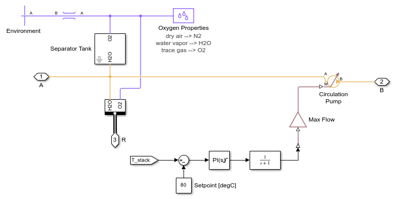 循環ポンプにより、電解槽のアノード側に連続した水の流れが供給されます。消費された水は熱流体ネットワークから除去され、余剰水は再循環されます。アノードで生成された酸素は余剰水の流れによって運び出されます。これは、アノード湿り空気ネットワークで別途モデル化されています。分離器槽は、酸素が排出されるまでの再循環の流れにおける水と酸素のバランスをモデル化したものです。供給ポンプにより、システムに真水が補充されます。