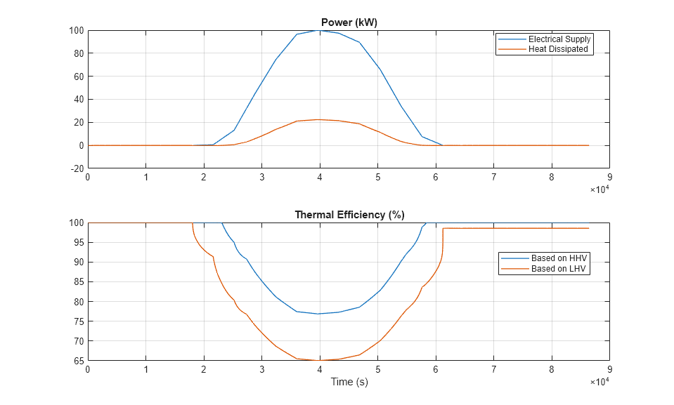 次のプロットは、電解槽による消費電力を示しています。この電力は、さまざまな損失により、水素の生成に必要な電力よりも大きくなります。この違いは熱の放散によるものです。