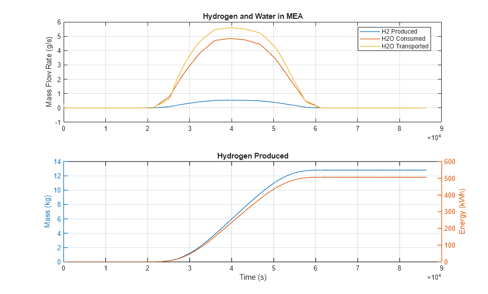 このプロットでは、生成される水素の合計質量と高位発熱量に基づく相当するエネルギーも示しています。これにより、燃料電池での電力の生成に水素を使用した場合の利用可能なエネルギー量がわかります。