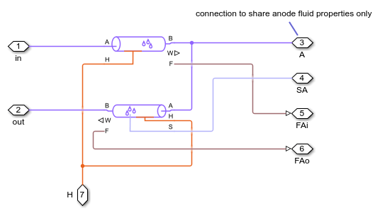 カスタム MEA ブロックは Simscape コード FuelCell.ssc で実装されます。アノードとカソードの気体チャネル パイプ ブロックの出力端子 F により、燃料電池反応のモデル化に必要な気体モル分率が提供されます。アノード気体流とカソード気体流からの H2 と O2 の除去は、Controlled Trace Gas Source (MA) ブロックにより実装されます。H2O の生成と MEA での水蒸気の移送は、Controlled Moisture Source (MA) ブロックにより実装されます。反応により生成された熱は熱端子 H を経由して、接続されている Thermal Mass ブロックに送られます。実装の詳細については、コード内のコメントを参照してください。