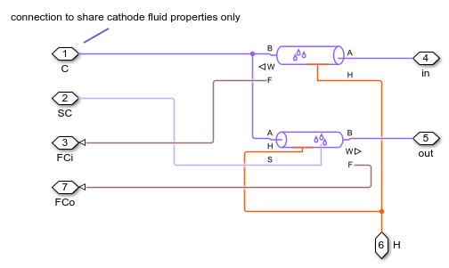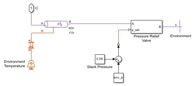2 つの湿り空気ネットワークはそれぞれ異なる気体混合体を表します。アノード ネットワークは窒素 (N2)、水蒸気 (H2O)、水素 (H2) で構成され、燃料を表しています。水素は燃料タンクに 70 MPa で保存されています。減圧バルブにより、水素が燃料電池スタックに約 0.16 MPa で放出されます。消費されなかった水素はスタックに再循環されます。カソード ネットワークは窒素 (N2)、水蒸気 (H2O)、酸素 (O2) で構成され、環境からの空気を表しています。燃料電池が酸素不足にならないように、コンプレッサーが空気を指定された速度で燃料電池スタックに送ります。圧力安全バルブにより、スタック内の圧力は約 0.16 MPa で維持され、排気は環境に放出されます。