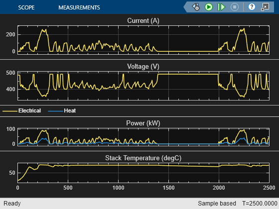 さまざまな負荷条件で効率的な動作が確保されるよう、燃料電池スタックの温度と相対湿度は最適なレベルで維持されなければなりません。温度が高くなると熱効率は上がりますが、相対湿度は下がるため、膜抵抗が高くなります。そのため、このモデルでは、燃料電池スタックの温度は摂氏 80 度に維持されています。冷却システムは電池間で冷却水を循環して熱を吸収し、ラジエーターによって環境に熱を放出します。加湿器は気体を水蒸気で飽和させることにより、膜を水和状態にし、電気抵抗を最小化します。