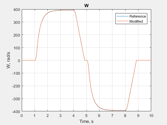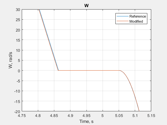 simscape.logging.plotを使用して結果を比較し、参照結果と修正モデルの結果を単一のプロットに描画します。simscape.logging.plot... ({simlogRef.Measurements.Ideal_Rotational_Motion_Sensor.W... simlog.Measurements.Ideal_Rotational_Motion_Sensor.W}, ... 'names', {'Reference','Modified'})