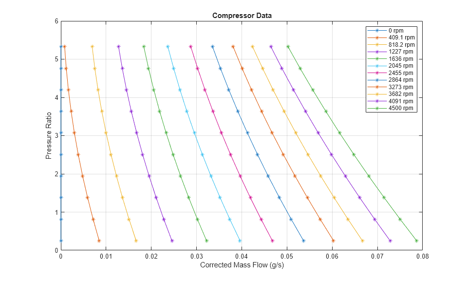 次のプロットは、さまざまなシャフト速度でのコンプレッサーの圧力と流れの関係を表す曲線を示しています。ここでは、回転するシャフトはモデル化されていません。コントローラーによって、必要な流量を生成するためのシャフト速度が直接に設定されます。