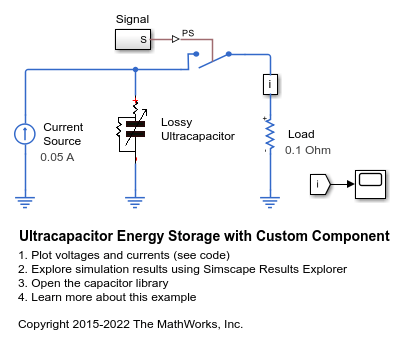 この例では、Simscape™ のサンプル ライブラリ Capacitors_lib の使用方法を説明します。モデルはサンプル ライブラリのコンポーネントを使用して作成されます。回路は 0.05 A の定電流源でウルトラコンデンサを充電し、負荷に対して電流パルスを供給します。ウルトラコンデンサは、電流源からの直接供給よりもはるかに大きな電流の供給を可能にします。ライブラリには、忠実度が異なる複数のコンデンサ モデルが含まれており、性能の低下と非線形性の影響を調べることができます。