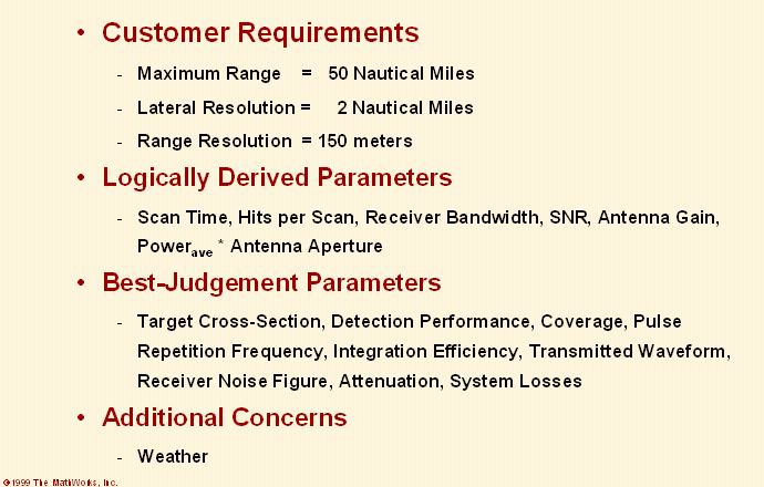 レーダー システムは特定の目的に合わせて設計されるものであり、他の用途にも効果的に使用できるということはまずありえません。パラメーター値は、新しいレーダー仕様ごとに新たに計算する必要があります。ある用途に使用するレーダーを設計する場合、その設計を形作るパラメーターは多数にのぼります。このようなパラメーターの中には、顧客仕様に含まれているか、または顧客仕様から論理的に得られるものがあります。また、設計技術者の最良の判断のもとで任意に選択されるものもあります。これは、システム設計の最初の近似解です。そこから設計パラメーターに何度も修正を加えていった結果、最良の設計にたどり着きます。顧客仕様に変更が生じた場合、設計プロセスを最初からやり直さなければならなくなることもあります。設計方針は、こうしたパラメトリックな性質をもつことから、自動化に向いています。