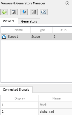 ブロックを追加せずにモデルをインストルメント化するには、[ビューアーおよびジェネレーター マネージャー] の使用を検討してください。マネージャーを開くには、[シミュレーション] タブの [準備] セクションで、[ビューアー マネージャー] を選択します。この例では、[ビューアーおよびジェネレーター マネージャー] は、2 つの信号 Stick および alpha を Scope1 という名前の Scope ブロックに記録するように設定されています。