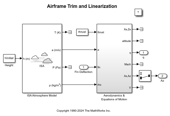 op = findop('AirframeTrim',opspec); io(1) = linio('AirframeTrim/Fin Deflection',1,'input'); io(2) = linio('AirframeTrim/Selector',1,'output'); io(3) = linio(sprintf(['AirframeTrim/Aerodynamics &\n', ... 'Equations of Motion']),3,'output'); sys = linearize('AirframeTrim',op,io);