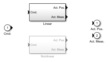 シミュレーションを変更するには、線形アクチュエータではなく、非線形アクチュエータを使用します。Variant Subsystem ブロックの [バリアント]、[オーバーライドの方法] コンテキスト メニューを使用することで、これを実行できます。