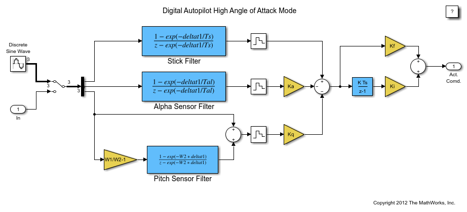 この例では、高迎角コントローラーのデジタル自動操縦設計の第 1 段階について説明します。この例のすべてを実行するには、Control System Toolbox、Simulink Control Design、Simulink、Simulink Coder™ を保有していなければなりません。ただし、これらの製品のうちもっていないものがある場合でも、MATLAB® エディターのセルの実行モードを使用して、この例の一部を実行することが可能です。
