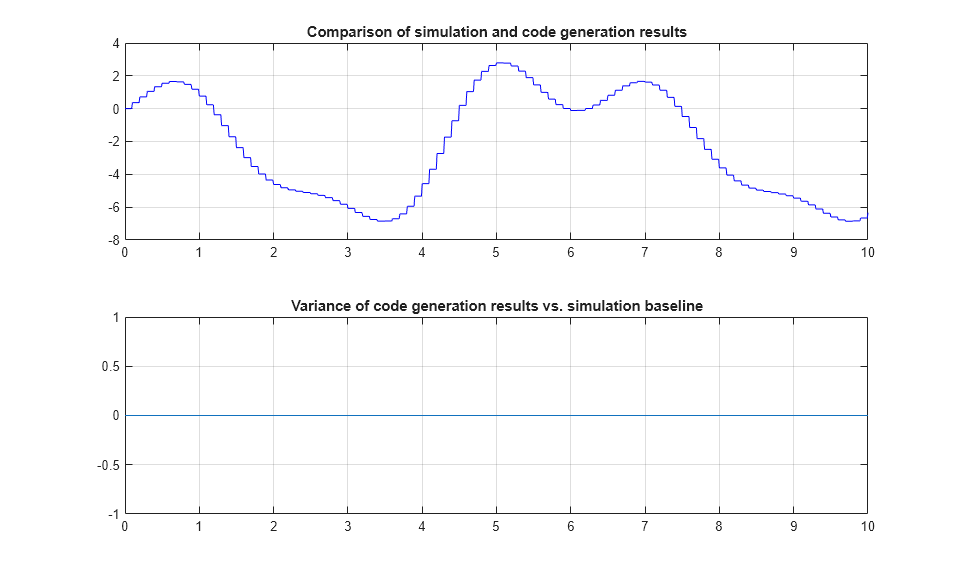2 つの変数 rt_tout および rt_yout がワークスペースに表示され、シミュレーションのベースラインに対する分散をプロットできます。ただし、このホスト上のこのモデルに関しては、分散は事実上ゼロです。これよりも計算が複雑な場合は、小さな数値分散が予想されます。これは、コンパイラの最適化の違いや、倍精度の 64 ビット ストレージ形式よりも高精度な中間レジスタ変数の使用によるものです。分散が大きい場合は調べる必要があります。モデルのアルゴリズムの数値安定性や、コンパイラまたはランタイム ライブラリのバグといった問題の表れである場合があるからです。