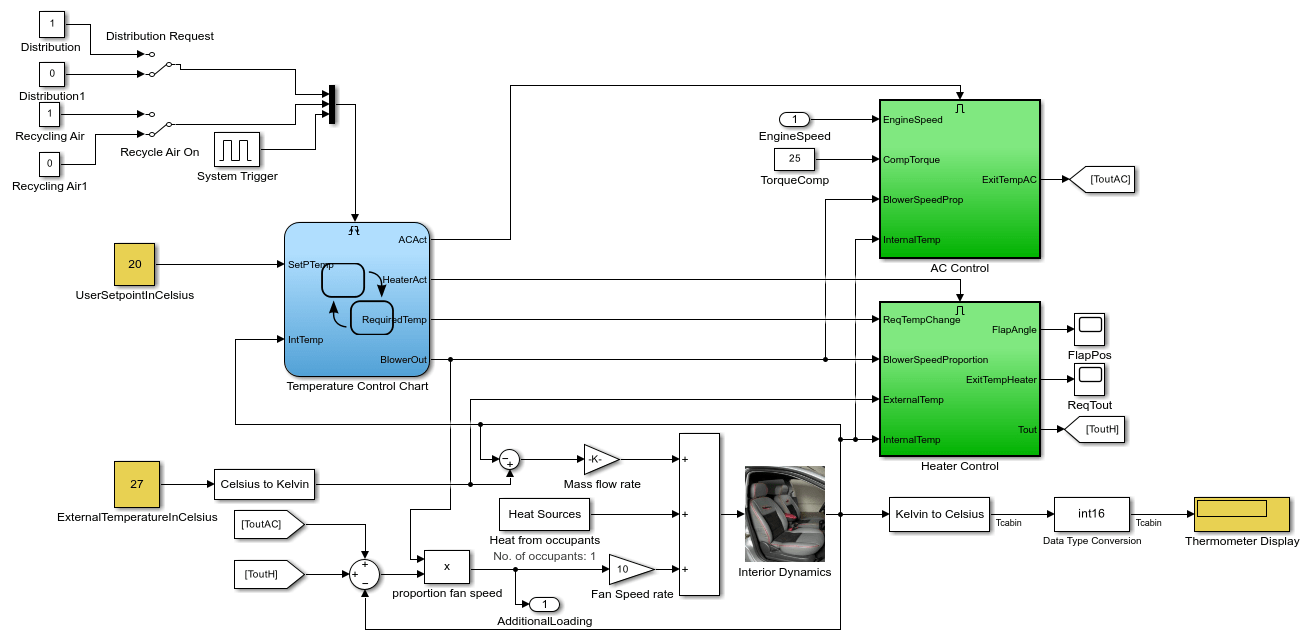 エアコン (AC) システムは、室温調節モデルが自動車の電気システム モデルとインターフェイスする 2 つの場所のいずれかです。エアコン システムがアクティブになると、コンプレッサーは自動車のエンジンに負荷をかけます。このモデルでは次の方程式を実装して、エアコンの最終温度を決定します。