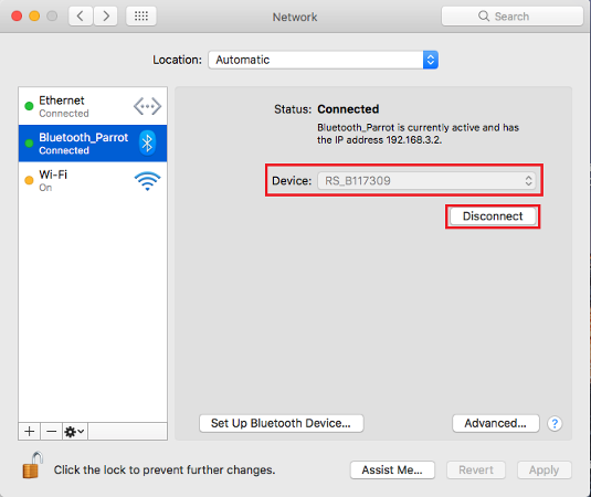 1. Browse to System Preferences > Network > Bluetooth_RS and click the Set Up Bluetooth Device… button. Your computer searches for all the Bluetooth-enabled devices in its range. Wait a few seconds for the minidrone to appear.