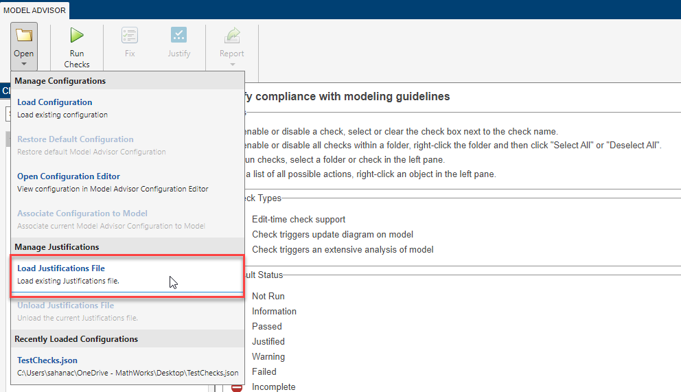正当化ファイルを読み込むと、以前にドキュメント化した正当化をモデル アドバイザー チェックに簡単に適用できます。つまり、正当化を最初から追加し直さなくても、現在の設定にすばやく簡単に再利用できます。正当化ファイルを読み込むには、次のようにします。