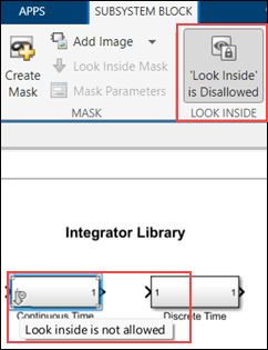 To hide the implementation details of the Subsystem block Continuous Time, select the Subsystem block. In the Simulink Toolstrip, on the Subsystem Block tab, in the Look Inside section, click 'Look Inside' is Allowed. This will disable the option to view the implementation details of the Subsystem block, through the user interface and programmatically by using open_system(blk,"force"), where blk is the full name or path of the Subsystem block in the open or loaded model.