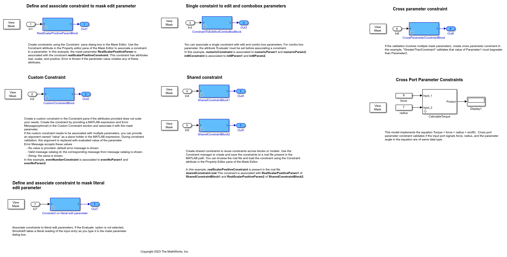 マスクには、ユーザー入力値を受け入れるパラメーターを含めることができます。マスク ダイアログ ボックスを使用して、マスク パラメーターの入力値を指定できます。マスク パラメーターの制約ではマスク パラメーターに対する検証を作成することができ、独自の検証コードを記述する必要はありません。制約により、マスク パラメーターの入力値が必ず制約に関連付けられたルールを満たすようになります。たとえば、Subsystem ブロックのマスクについて考えます。入力値が偶数でなければならないという制約を設定できます。偶数でない入力を提供すると、エラーが表示されます。指定するルールが属性の 1 つとして存在していない場合は、スカラーを返す MATLAB® 式を指定できます。リテラル編集パラメーターを制約に関連付けることもできます。制約は、使用可能な属性で指定されたルールか、MATLAB 式のいずれかです。