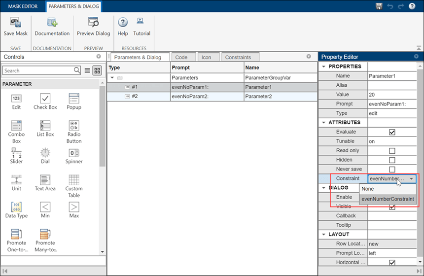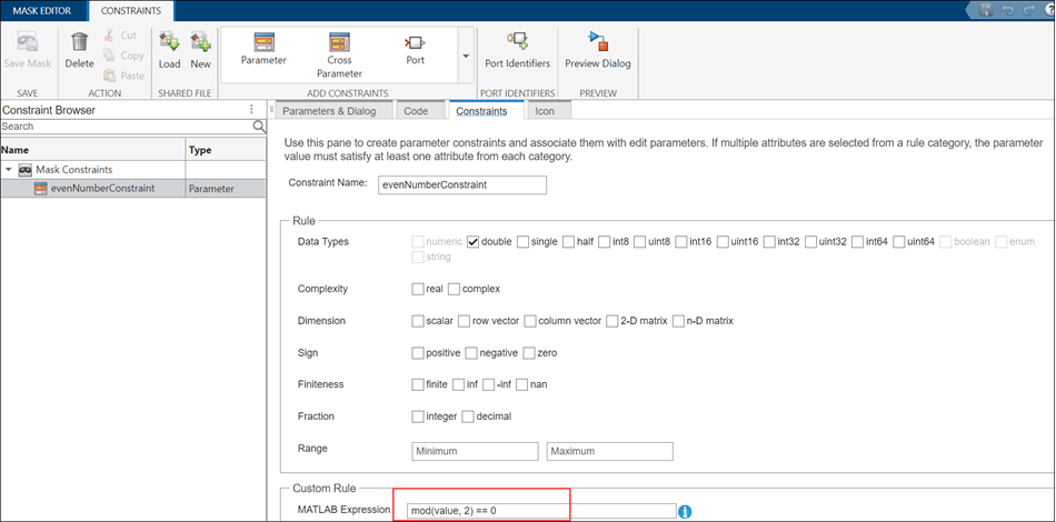 モデル例には、ブロック パラメーター evenNoParam1 と evenNoParam2 が偶数でなければならないサブシステム ブロックが含まれています。指定するルールが属性の 1 つとして存在していないため、MATLAB 式を使用して制約をカスタマイズします。