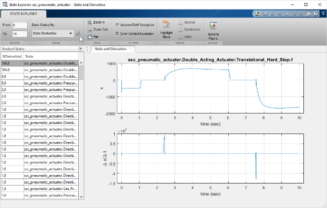 ソルバー プロファイラーに連続状態のログを記録すると、状態エクスプローラーを開いて各連続状態を調べることができます。状態エクスプローラーは次のメトリクスにより連続状態をランク付けします。