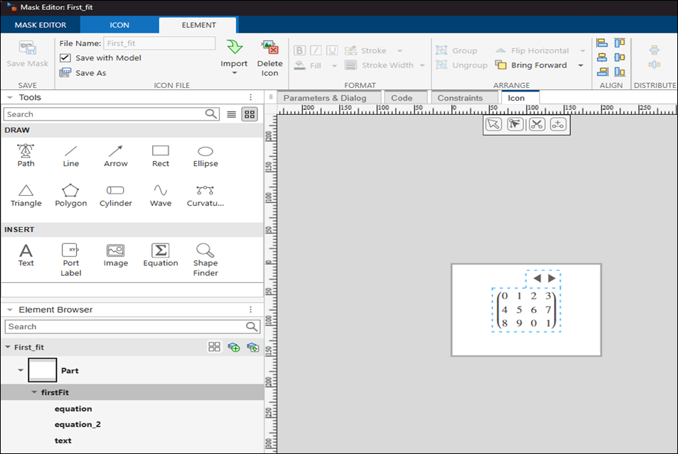 2. Click the Icon tab, in the icon canvas, insert the equation tool and specify the LaTeX equation \pmatrix{0 & 1 & 2 & 3 \cr 4 & 5 & 6 & 7 \cr 8 & 9 & 0 & 1} and \pmatrix{3 \times 4} to display the values and dimension of the matrix respectively. Create a text element K to display the index of the matrix.
