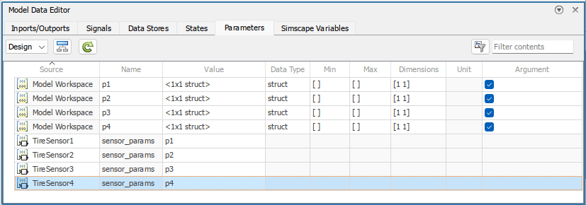 モデル データ エディターで、パラメーター pSensorArray がモデル ワークスペースに格納されていることを確認できます。このパラメーターに、モデル引数 p1、p2、p3、および p4 の新しい値を提供する sensor_params 構造体の入れ子配列が格納されています。