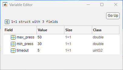 変数エディターを使用して、これらの構造体の値を更新し、異なる最小圧力、最大圧力、タイムアウトを使用して配列のセンサーをテストできます。モデル データ エディターで、pSensorArray の [値] 列をクリックし、3 つのドットが縦に並んだボタンをクリックして [変数エディターを開く] を選択します。