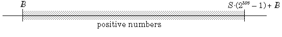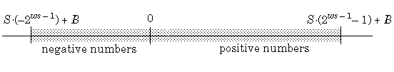 範囲とは、固定小数点データ型とスケーリングで表現できる数値の範囲です。以下に、語長 ws、スケーリング S およびバイアス B の符号なしの 2 の補数の固定小数点数で表現可能な数値の範囲を示します。