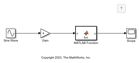 MATLAB 関数は、ベース ワークスペース変数 k の値に基づいてサイズを変更する入力信号を受け取ります。k は、開いたときにモデルが定義する配列です。Gain ブロックは入力信号に k を乗算し、この信号を MATLAB Function ブロックに出力します。入力変数のサイズを入力信号のサイズに一致させるために、MATLAB Function ブロックはカスタム サイズを入力変数 u に割り当てます。MATLAB Function ブロックを開いて変数およびコードを表示します。