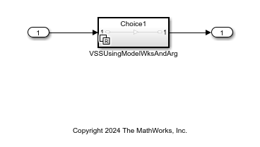 In this model, the active variant of run-time Variant Subsystem block RuntimeVariantModelArgumentWithoutPM/VSSUsingModelWksAndArg is controlled by using the variant control expressions mdl_arg == 1 and mdl_arg == 2. Parameter mdl_arg is defined in the model workspace for subsystem RuntimeVariantWorkspacesArg.