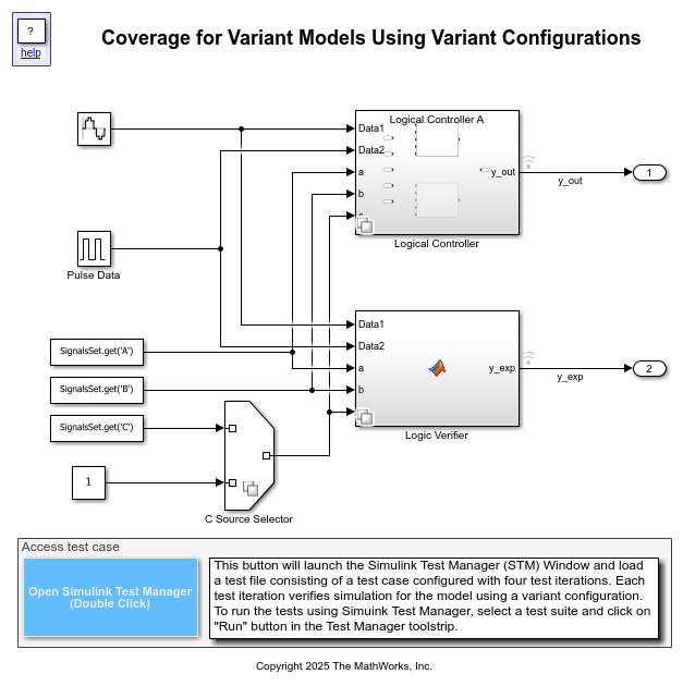 The slexVariantConfigsCoverage model has a baseline test case named Verify Controller Implementations, saved in the test file dVariantConfigsCoverage.mldatx. To launch the Test Manager and open the test file, double-click the Open Simulink Test Manager button in the model.
